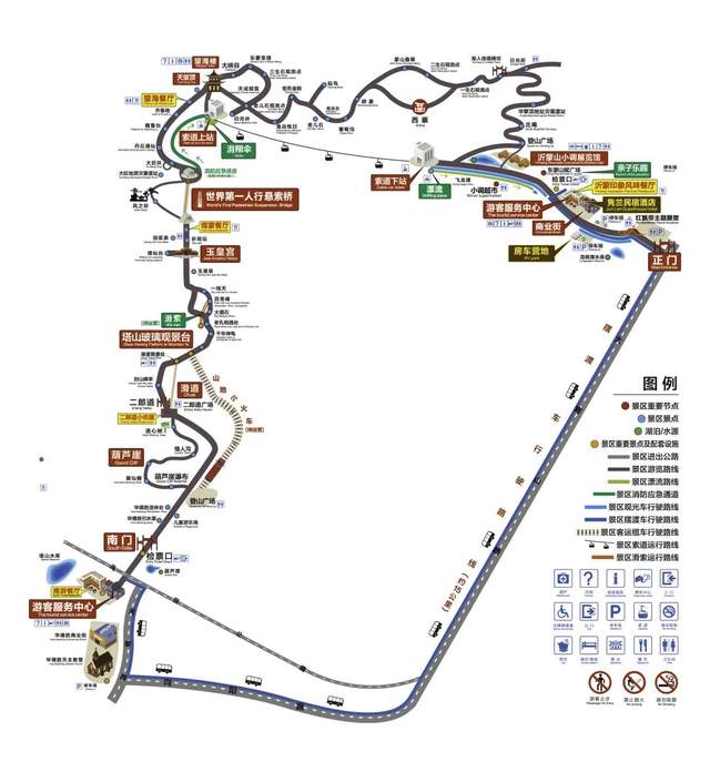 东游客中心--沂蒙山小调展览馆--登山广场--日光岩--西寨--望海楼--世界第一人行悬索桥--玉皇宫--玻璃观景平台--滑道--南游客中心(也可以按照路线从南游客中心出发)